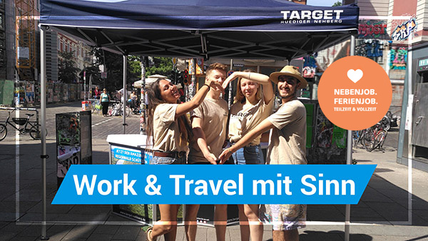 Gutes tun, Spaß und Abenteuer – all das verbinden wir in Deinem Ferien- und Nebenjob bei TARGET e. V. Als dialogendes Teammitglied hast du die Chance an unserer bundesweiten kostenfreien Reisetour durch Deutschland teilzunehmen. Plane mind. 3 Wochen am Stück ein. Du kannst bei TARGET e. V. einen sehr flexiblen Nebenjob starten, Geld verdienen und Gutes tun!
